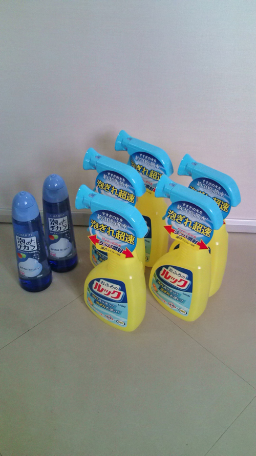 お買いものに行ったボランティアさんが、スプレー式がいい!とセレクトしたお風呂用洗剤5本と、台所洗剤2本を購入しました。